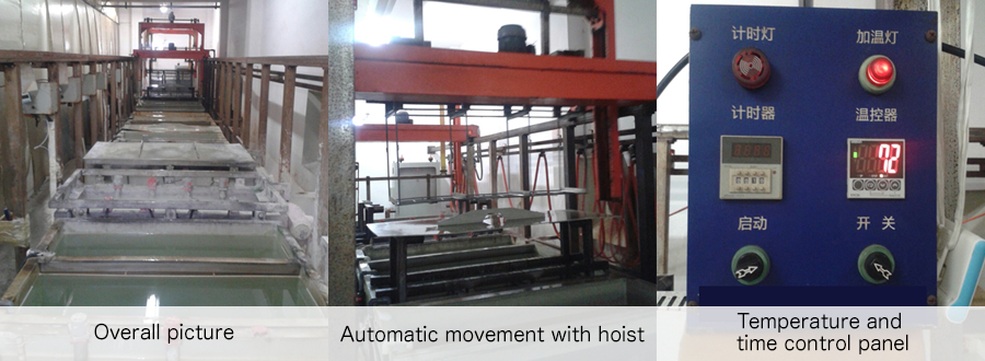 | Content detail | Processing length of time each tank, moving between tank to tank was done manually by workers. | The immersion time is controlled by an alarm system. Moving to each tank was made automated by using a hoist. |